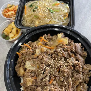 Our two top sellers combined into one rice bowl. Half portion of the bulgogi and half portion of japchae.