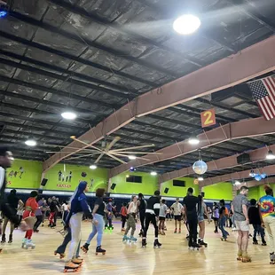 It's nice to have a decent rink in the area but I hate that this one is located so far away. There used p be a location on the North side of town, but I never cared for the fact that the floor was concrete. At least this location has hardwood floors. The parking lot was full when we went, so we had to park at the Lidl across the street. It's time for skates to expand their parking lot. They have adult skating on Thursday and Saturday nights I believe, and on a recent visit, the rink was jam packed. I don't own my own skates so I did have to rent them, but I was happy to see that they've invested in new skates since the last time I've been. Makes sense since that was years ago. They've also added a climbing situation for kids which I'm sure keeps them busy on family nights. Plenty of seating, good options and skate supplies. Can't wait to go back although I never look forward to the drive.
