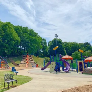Really nice park! Had a bunch of slides! Ground around playground is soft and kind of foam like!Splash pad is super nice as well!