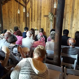 Rustic elegance at the wedding ceremony in the Farmhouse Barn at Langtree Plantation
