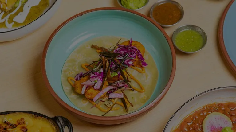 cheesy braised pork tacos, pozole consume, onion, cilantro, radish, diced cabbage, salsa diabla