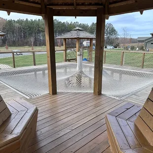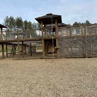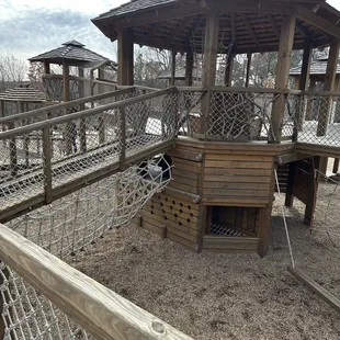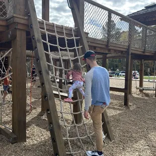 Fantastic wooden playground! My 2 year old loved it. It's all wooden or roped with the exception of the slides. Bridges, nets, rope climbs throughout! I reallllly appreciate how this playground is designed ie not having multiple cutouts at the very top (so I don't have to worry about my toddler falling). This playground reminds me of the ones I played on way back in the 90s. Lots of parking. Nature center on site. I will be back when in the area!