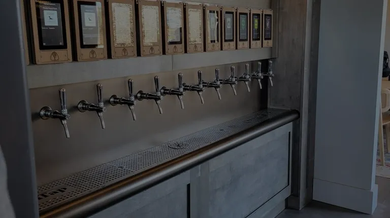 a row of beer taps in a sports bar