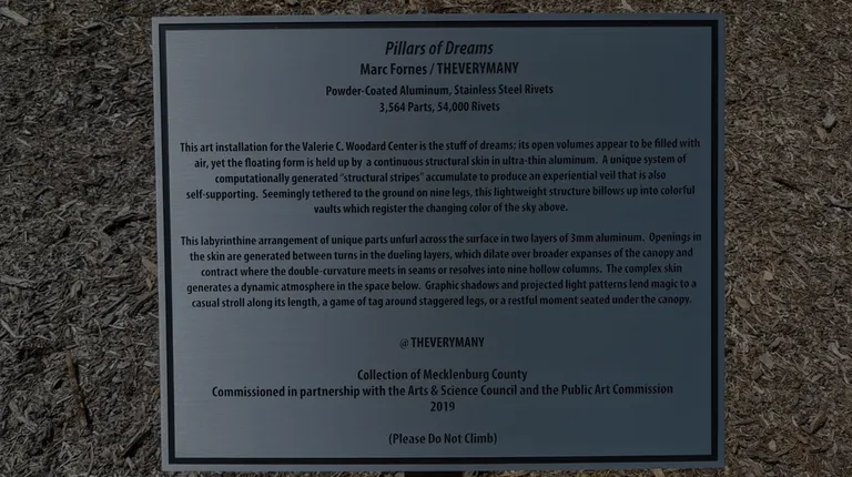 Shiny and glittering out of the corner of my eye, this large piece of public art is placed near the front of the Valerie C Woodward Center facility that houses a number of Charlotte-Mecklenburg city/county offices.From the artist's website, "Pillars of Dreams... makes a soft landing in a field of quiet moments and curious interactions. Open columns drop down from the floating canopy into a field of seating, open paths for wandering, and unbounded spaces for self-assembly. More than an idiosyncratic space for individual discovery, Pillars of Dreams establishes a public agora for visitors and employees at this important community interface between local government and Charlotte-Mecklenburg residents." The caption points out that the artist is Marc Fornes and it is powder-coated aluminum with stainless-steel rivets making up some 3564 parts and 54,000 rivets.Step into and under the center of this public art for a moment. The artist has put openings into the aluminum skin that let some light in. It reflects off the pieces and makes for a pretty sight. Shadows, projected and reflected light in the space below are lovely. Check it out when you're in the area.[Review 13437 overall, 756 of 2020.]