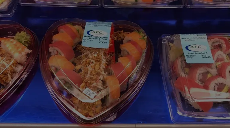 a plastic container of sushi