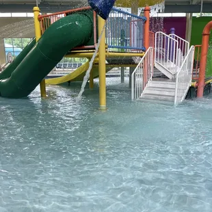 Large blue water slide (48"+), fun whirlpool (pictured here), water play area (0 depth to 2.5" in background).