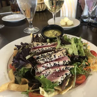 I had the seared tuna with a salad and ginger dressing. The tuna was good-seared nicely with a black pepper and sesame coating, ginger dressing is made in house-nice flavor, good portion. The homemade rolls that are complimentary were very good! Positive stuff:The staff is great-- they work hard to make sure your experience is good. Food is good- they have rotating menu. Negative stuff:Well, nothing really negative but just for info--they are renovating the main dining hall so they using the golfing bar area, outdoor seating, and tent if weather is bad Extra info:It is a private club so you must be or know a member.