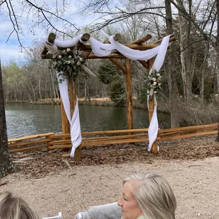I attended this wedding for a couple that I have known for many years and care deeply for. They were like family to my family. My daughter was IN the wedding. She warned us about "Karen" that exuded misery at the pre-wedding / rehearsal events. That didn't quite prepare us for the experience we were about to have. We were being responsible by carpooling to the event. We arranged two designated drivers and two separate cars to take us to the wedding. We thought there was a possibility of a sizable crowd and thought it would reduce the number of cars taking up space in the lot. I arrived in the first car very early. I stood beside my car awaiting the rest of us to arrive any minute. A man with a Napoleon Complex quickly tore into us for NO reason. He accused us of "tailgating". The rest of my party arrived during his diatribe. He threatened to remove us from the property if he caught us returning to our cars. He continued his aggression until we walked down to the venue area. Totally unwarranted and 100% classless! The inside venue space was pretty. The table setting(stemware, flatware, napkins, tablecloth)was pretty. We walked outside to white folding chairs overlooking a community fishing pond. They had an arbor set up with white netting and two floral arrangements tacked to it. The walking paths from the venue building and the area among the wedding space was made of driveway gravel. This was fun for the ladies in heels to walk in. The ceremony was beautiful. The bride was breathtakingly gorgeous. Their vows were tear-inducing. After the exchange of vows we all headed to the inside space for cocktail hour. There was NO liquor, therefore, it was actually beer and wine hour. It didn't take long for all of the wines to run out except for a super sweet Moscato that wasn't really good. Before the dances and speeches began the buzz inside was that someone in the grooms family was getting booted from the venue. I could see him outside receiving the wrath of the venue's gestapo. He was in disbelief that he had to leave the event. I walked outside after he had gone and the three guys with an earpiece were gleefully discussing their accomplishment. The buffet line went quickly. There was only one meat- chicken with something sprinkled on it. They had two starchy sides- mac and cheese and mashed potatoes. They also had a bowl of iceburg lettuce with cucumbers in it and a roll. The mac and cheese was actually pretty good. They had a wedding cake and I never got to taste it. The speeches and first dances were beautiful. The DeeJay did a great job. The music selections were varied to appeal to the wide range of ages and tastes of the wedding attendees. The garter throw and the bouquet toss were memorable. It was awesome to see the love and respect amongst the guests. I had to step outside for a few minutes to get away from the loud music. Guess what? The three guys were outside tossing one of the groomsmen! I found out later that they had also threatened the groom's brother as well. This crowd was so well-behaved. I hate that thing I will most remember from this wedding is the three guys with an earpiece. I was personally verbally attacked bu one of these guys for NO reason. These guys need two things, 1) a psychologist to help them with their aggression and anger issues and 2) a new job that doesn't involve interactions with the public.