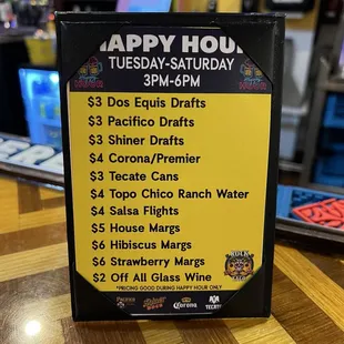 They have unique plates. We've had various tacos. The dirty bird is one of our favorites and I love their salad. We normally dine during happy hour. Their margaritas are tasty! We've always had great service.