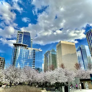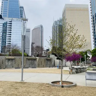 Nate and I walked through this park while stranded in Charlotte due to some flights affected by weather. I'm glad we chose to wander through, because it was really beautiful. The flowers were blooming and it was a wonderful sunny day. There's a big fountain, a shiny sculpture, and we enjoyed a musician who brought his whole drum kit to the park. The views are great - you can see lots of tall buildings and those cherry blossoms were so pretty. If I lived in this area, I'd try to visit this park all the time. I think it would be a great spot to hang out, relax, and get some sunshine! It seems to be pretty centrally located with lots around.