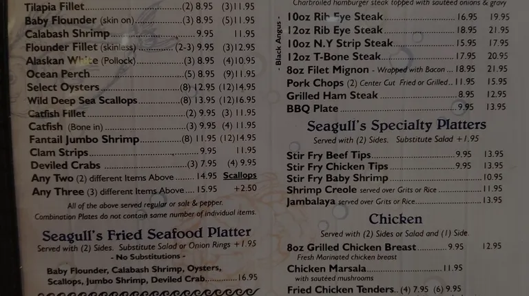 This is one of my husband's favorite places to eat. He loves their Stir Fry. He's a very fussy eater and just loves eating there. It's very affordable so maybe that has something to do with it. But he goes at least once a week after playing golf with the guys & has the Beef Stir Fry. I've been there once but can't rave about. I had the Shrimp Stir Fry and was surprised because I've never seen shrimp so small. Lots of them but tiny. Very tiny. The 'corn bread' is also tiny. Shaped like 'spaetzle.' He loves it. All his golf buddies love eating at 'Seagulls' as well. Go figure! Chatting with folks who were there while we were, they all raved about the food & prices. Some have been 'regulars' for years. Most everyone raved about the burgers. Service is very friendly too.