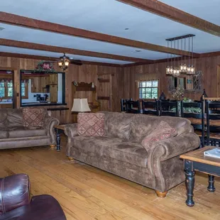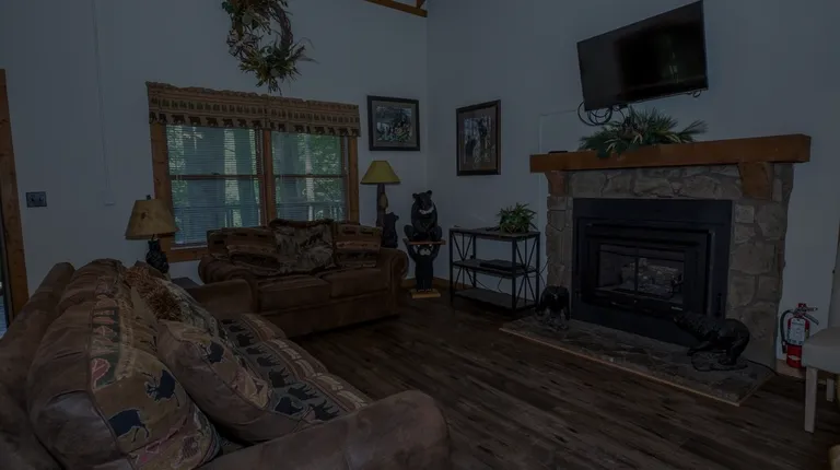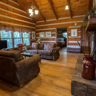 Whispering Pines Cabin: Open Plan Living Room with Dish TV and Wood Burning Fireplace