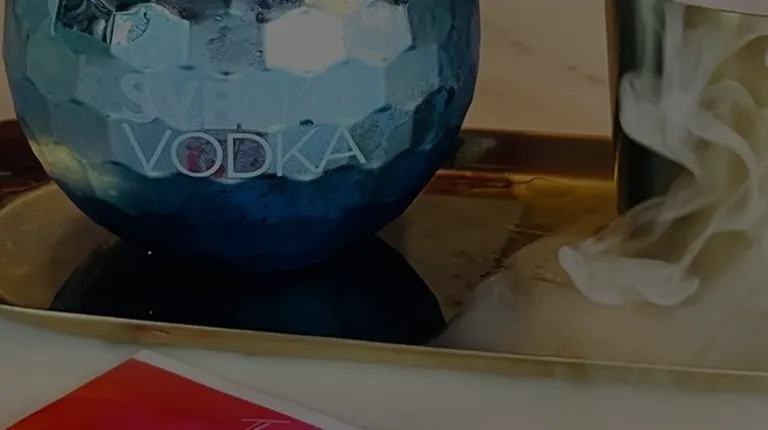 a blue cocktail in a glass on a tray