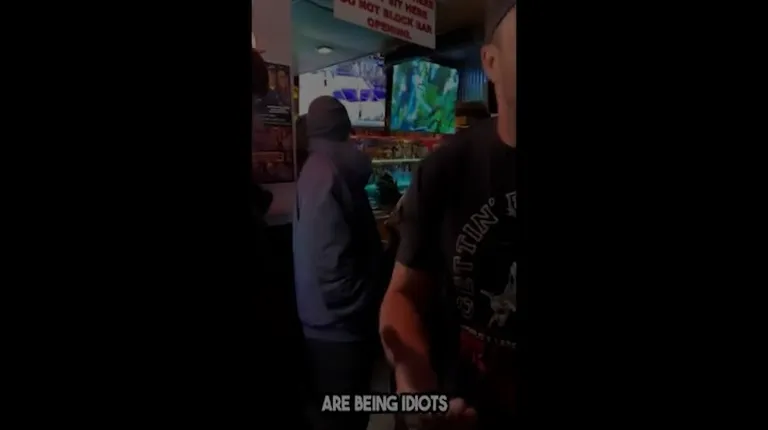 a man in a black t - shirt standing in front of a bar