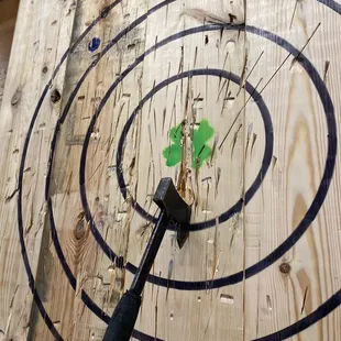 Had a great time throwing Axe/hatchets for the first time. I've been meaning to try this out, but while in town visiting a friend, I figured what better way to spend some time doing this while hanging out.The attendant (owner?) Brad was really cool. We paid up and he showed us how to throw (neither of us had done it before). He quickly went over the rules which are simple and common sense such as "don't throw axes at other people", gave us a demonstration and then watched us throw a few before walking away encouraging us to have a good time.The boards are marked so that you can record scores and a sheet posted of some games you can play to make it interesting. We played a couple games but honestly had the most fun just throwing and trying to get it as close to the bullseye as possible.This was great way to spend an hour and would definitely recommend if you're visiting here. Feel free to bring a 4 pack over from the nearby brewery across the way.