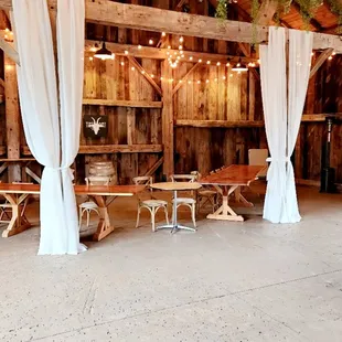 Drapery. Market lighting. Large outdoor cocktail area adjacent to venue barn. Spacious dance floor.
