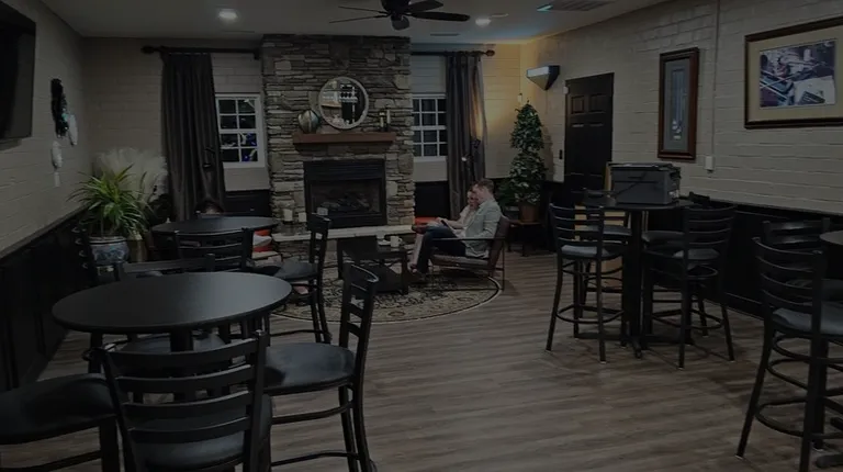A large fireplace in the dining area