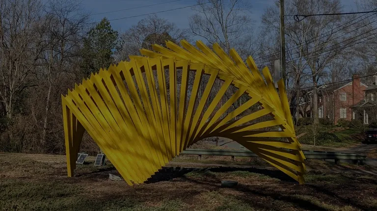 Located on a small triangle of land at the southern end of Charlotte's Latta Park, this bright yellow artwork is the ultimate in upcycling or recycling. The artwork is made from the line of trolley tracks that were buried underground since the 1930's when they brought people from the city's first suburb into downtown. They were uncovered in 2010 during roadwork on East Boulevard.The rail pieces were fused into V's and then assembled into something that looks like a DNA double helix and were then painted a vibrant yellow. The sculpture is pointed with one end toward downtown and one toward Dilworth, a reference to the two placed the rail used to connect.Nearby, a caption gives some history of the transportation in the city, dating back to the 1880s with horsecars through the 1930s when gas motorbuses were introduced.It is a striking artwork and with the bright color, you won't miss it.[Review 14482 overall, 1808 of 2020, number 2736 in North Carolina.]