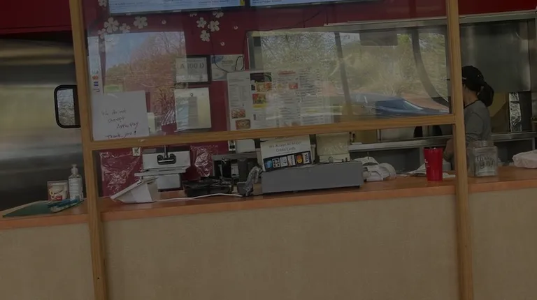 a restaurant counter with a man in the background