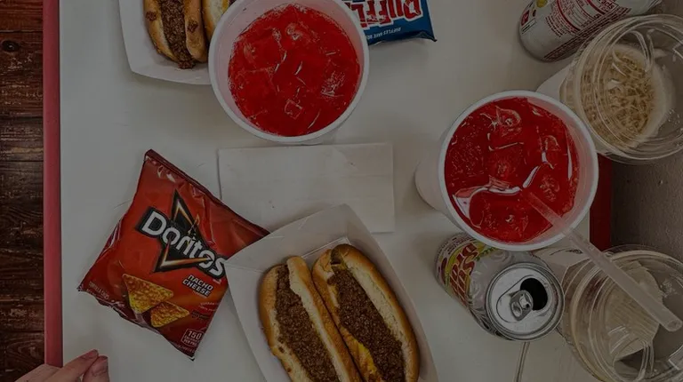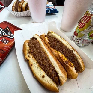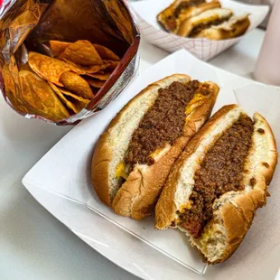chili dog, chips, and another chili dog
