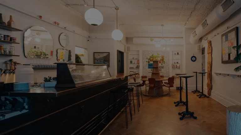 a coffee shop with a black counter
