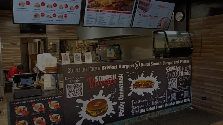Was looking for a smash burger for lunch and yelped and this place showed up. I am not Muslim but wanted to give it a try. The storefront is nice and the inside is very clean with cool sign when you walk in and very nice menu boards. There is a room off to the site for people to eat as well as long the window. Workers were very nice but didn't understand English the best. I ordered the double smash burger meal that came with a double smash burger fries and a can of pop. Burger is actually made of brisket, which was delicious. Worth the trip just for that. I personally didn't care for the fries but I know most people will like them. We also ordeee chicken tenders which were good as well. The only complaint was they throw the hot oily chicken fingers directly into the styrofoam container, which melted it and grease all over the bag.