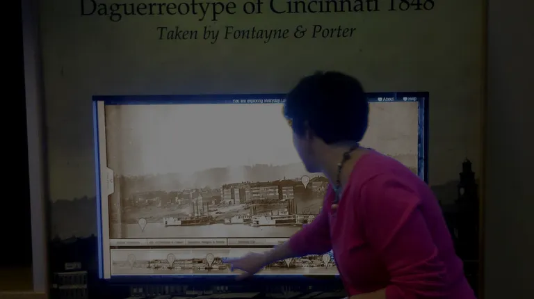 On September 24, 1848, Charles Fontayne and William S. Porter set up their camera on a rooftop in Newport, Kentucky and panned across the Ohio River. Their daguerreotype photograph captured two miles of the Cincinnati landscape, which was stored on eight separate, silver-coated plates. 160 years later, this photograph has been restored in an exhibit in the Cincinnati Public Library, and is the oldest comprehensive photograph of any American city.The Cincinnati Library created an exhibit in their Cincinnati Room about the preservation of the photograph, history of the photographers, as well as a look at the creation of daguerreotypes. The original panorama is on display and is also on a giant, 52" touch screen television. The touch screen display allows users to scroll with their fingertips (like using an iPad) and click buttons to learn more about specific locations. You can also zoom in on the details of the photograph up to 32 times.Some details you can see are the old steamboats, a ghost-like man with a chip on his shoulder, the earliest recorded images of African Americans, and laundry hanging from a clothesline. Impressively, you can also see the green, rural hilltops of what is today Mount Adams, Brighton, and Clifton.I spent an hour in the exhibit today and only saw about half of the daguerreotype's details. I plan to go back and park a chair right in front of the 52" screen and learn until my heart's content. This is a must-see for every Cincinnatian and visitor who wants to learn about the history of our great city.Cost: FreeViewing Time: 90 minutes - 2 hours