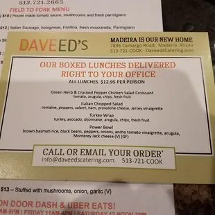 Daveeeds provided the dinner for the diner en blanc this year end it was disastrous. Salads thrown into baggies, s huge bunch of lettuce, and ind chicken breast (also presented in s Baggie) to be shared by 2 people. All for the low low price of $125. He had a captive audience if potential customers and completely blew it with this thoughtless and cheap meal.