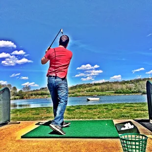 Two words: Hidden gem. Whenever I am feeling stressed or if it is an abnormally beautiful summer night I love to come here and hit off the top dock. I have been playing golf since I was three years old and this is a perfect oasis for me. It's quiet, serene and you can even get a strawberry shortcake ice cream in the shop. WIN!There is a small pro shop at the end of the long entrance. A basket of balls comes in $5 or $10. The large is $10 and is more than enough. This will last you about an hour. There are three places to hit, all of which go into a beautiful lake. The top deck which is my favorite, the tee's, and the grounds. The tee's are somewhat unpredictable and if it's hot out there is NO shade. My favorite part are the different colored boats in the water. If you hit any of them you pretty much win the day. My only real complaint about this place was that I didn't have my clubs one day and I just wanted to stop by and hit some, and the clubs that they have are rusty and straight out of the 70's. It might be a good investment for even a few new ones. So be advised -- bring your own clubs. Other than that, this is one of my all time favorite places to pass the time. Check it out!