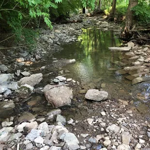 Interesting park. There seems to be one way in, and one way out. The park is a mix of nature trails, older playground equipment, green spaces and an event space. The event space is a stately old home. It looks to have been the grand home of the original land owner. Several places to park may be found throughout. The largest parking area is up near the event space. During our vist, a wedding was going on. The event space does look to be handicap accessible. We did not investigate further due to the wedding. Nature trails are fair to heavily wooded. The deeper one hikes the more shade that is present. The trails that we hiked had a good amount of soil loss due to water erosion. These lines show water flowing down the trail, and not into the creek. Crevices carved into the trails did make it harder to walk at times; particularly for our youngest hiker. I sliped once, and they fell three times. If we venture here again as a family, it probably wouldn't be for the trails. Our meandering from trail to trail did take us to a creek bed.What looks to have once been a sizeable creek, (based on the width of the bed, and the height of the shore around it,) is now a rocky path with pools of water. There microcosms are fascinating. We stoped at several of the small ponds. Some had small fish between the size of my pinky and index finger. These fish seemed cautiously curious about people. The fish appeared to be trapped in these pools. Hopefully the creek fills more than it is during heavy rains. An old well, and other carved out areas show how drastically different water levels once were. It would be interesting to observe after a series of heavy rains. The creek may be accessed from a staircase near one of the larger parking lots.