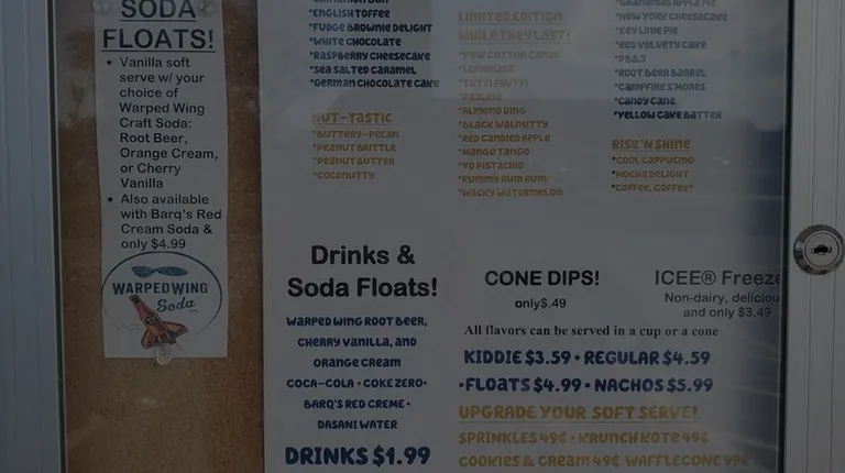 Lots of flavors. You order at the window and they call your name and flavor to pick up at the window. Benches are available, some in the shade, but most not. We tried the the black raspberry and key lime pie. The flavor for both is very mild, but fresh tasting. The serving size is generous, the employees were nice, and service was pretty quick.