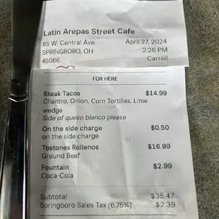Been wanting to try this place for awhile & finally stopped by. You place your order at the front & then seat yourself. There was a board with 2 specials (steak tacos, tostones rellenos) but no price. Hubby ordered the steak tacos while I got the tostones rellenos. It's a good thing I wasn't real hungry because the tostones rellenos looked like a small appetizer but the price wasn't small ($16.99). Hubby's 3 steak tacos were $14.99. We both agreed that the food was tasty but the price was high for the small amount of food we received. We left hungry.