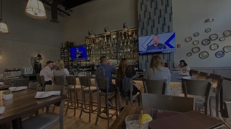 a bar with chairs and a television