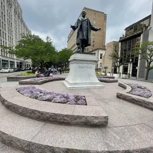 A nice small park in the middle of downtown. It's not much. Really it's like a median in 8th Street. Benches are here to sit at. This is located close to other things. It's not really a park to come run around. It's better for taking pictures or sitting. There's not a playground area for kids, because there isn't room for that kind of thing. It's located right in the middle of 8th Street, like a median. This goes between Elm and Vine. It has a statue of President Garfield. He was from Ohio. This is also pretty close to Fountain Square.