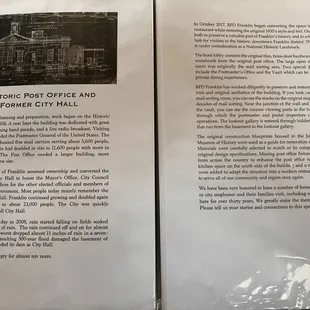 My wife learned of this through a friend's social media post. Weekday lunch, so wasn't busy at all. Very nice restoration of the old post office, PO Boxes, vault, post master's vault, and Big Band music playing. We had a nice Spanish moscato, shrimp cocktail (my wife did feel the shrimp were a little raw---I like it). She had a wonderful chicken parmesan and I had the seafood pasta. Finished with a very nice creme brûlée. Will be back!