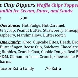 Get the dippers! I've never seen this anywhere else and it's such a good idea and so delicious. The base is vanilla soft serve surrounded by waffle cone flavored "chips." Next you get to pick your flavor of syrup and a topping (chocolate syrup and cookie dough pictured). It comes with a spoon just in case you run out of chips but basically you eat it like nachos. Lots of different varieties of syrups and toppings available. Other than that there are many other options to choose from at this ice cream stand. I believe they only take cash so don't forget.