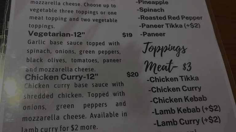 $22.80Curry sauce base with Onions, Bell Peppers, and Mozzarella Cheese. Topped with shredded lamb.