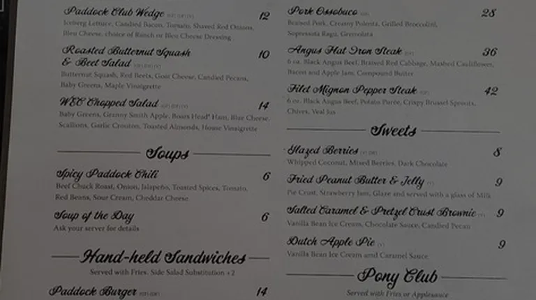 Good food. A decent variety served from their pricier entrees like a filet mignon, or a roasted chicken, then on to pasta fettuccine with a optional (chicken, salmon) protein if you like. Also, available some economical entree salads or a good sandwich variety. We had the spicy Korean chicken sandwich with a side salad incl. Also, a Basil Pesto chicken sandwich on a ciabatta roll with the choice curly Q fries. Both were pretty good. A 1/2 lb. Paddock burger's available which looked really good. A pretty well stocked spacious bar. Good mixed drink choices. Good wines and choice beer selections you'll probably enjoy. Along, with good attentive service. I'm recommending it because of my higher stds.! Good place. Especially during their major horse shows. Pleasant atmosphere.April 29, 2022 Update: Returned the next day. Not as attentive unfortunately. 2 1/2 stars on the lacking service. Different youngsters at the bar. Hope they get that corrected.