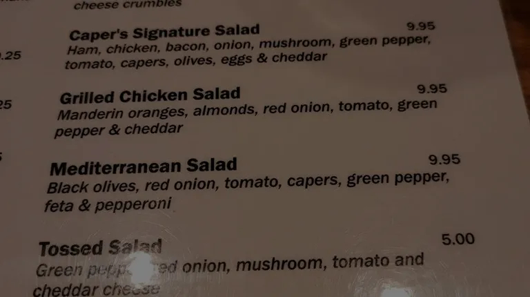 Great pizza sauce flavor and extra cheese! Also a nice crust that carries the multitude of yummy toppings to your mouth with just enough structure to accomplish the task ! I made my own original creation of ham, pineapple, Italian sausage and Greek olives. I brought two friends that were new to Capers and their comments were Great Pizza and we need to bring our adult kids here. We enjoyed their selection of bottled and " on tap" brews also. Enjoy this local gem... restaurant on left and bar on right.