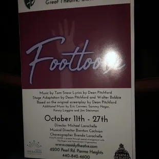 Tonight we came to the Cassidy Theater to see the production of Footloose. The theater is easy to get to, plenty of parking and did I mention they have senior discounts on tickets. There were three of us for the show, 2 regular tickets and 1 senior please! The show was fantastic, the actors ranged from young children, teens and adults and not only could they act but they could SING. They offer concessions and a 50/50 drawing during intermission! Did I mention we WON, $142 not a bad split! So make sure you check out the schedule for 2020, we will define back!