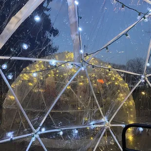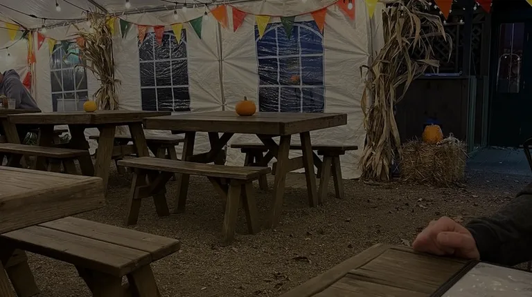 tables and chairs under a tent