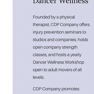 Saw a wonderful and entertaining performance by the Cleveland Dance Project Company. The group includes modern dance, jazz, and some ballet. The performance was fun. The audience chose songs and the dancers did improv to them. The founder is a physical therapist, and stresses movement and injury prevention, part of today's wellness awareness. The company has adult classes. It's involved in community outreach that includes creativity with dance. Seems like a group to get involved in.