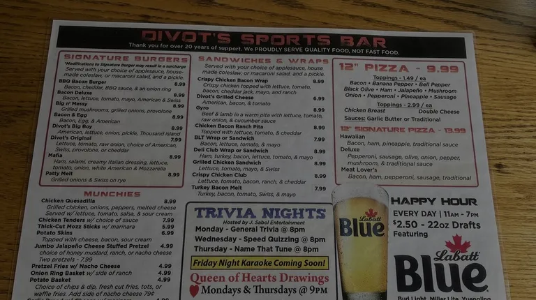 I've given this place the benefit of the doubt for far too long. Always seems like there is a catch.....went for wings on a special day where they are $5.99 a dozen. I asked the waitress if we could get two flavors.....she said yes. Never did she say they all have to be the same in order to get the special nor was it written anywhere....later look at my receipt and was charged 4.99 twice for the $5.99 dozen special. Called the place and person who answered could have cared less. Unfortunately this isn't the first time some obscure charge showed up. Heaven forbid you try to use Restaurant.com there. Based on this experience and prior ones, Divots is "dead to me" and I won't return. There are plenty of other establishments that are more than willing to take my money. Lesson learned....double check my receipt before leaving