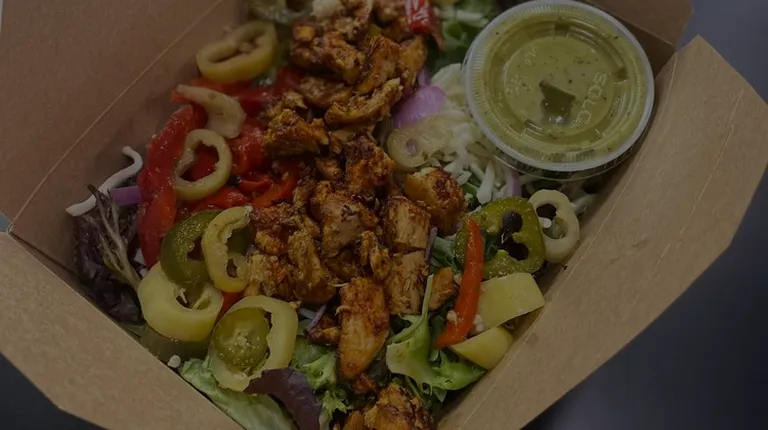 Roccos bowl with sweet potatoes, blackened chicken, guac, spinach and more
