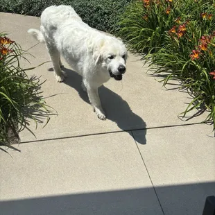 a large white dog laying on the floor