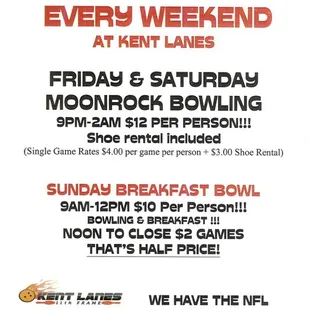 Pretty much your typical bowling alley, nothing fancy, modern or new at all, but does the trick. They have 24 lanes, and if you are on the first or last few lanes, it can get a little tight because there is a wall directly behind you. I recommend sticking to the middle if its busy. What really sets Kent Lanes apart is all of their specials. It seems like they have a moonrock all-you can-bowl deal going every single night. We have done their New Years Eve bowling party the last couple of years and enjoyed it. It's $90 total for 2.5 hours of bowling for up to 6 people, and that includes dinner (salad, garlic bread, pizza, pasta, meatballs, soda, chips). If you go early in the day, be ready to listen to hundreds of kids using their "midnight countdown" noise makers for, well, the entire two hours :)They have a full kitchen and a pretty big bar area, which is a separate room. You can order bar beverages from a window in the bowling alley that connects to the bar. A pitcher was $9, but it seems like they do plenty of specials. They also have volleyball courts and a tiki bar out there while leagues are going on.