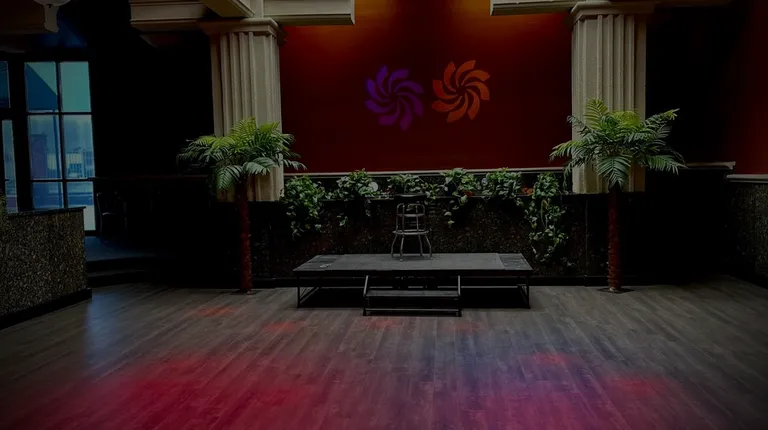 Dance floor (foreground) and karaoke stage (blue lights) viewed from the tables behind the stage- perfect seating to see it all