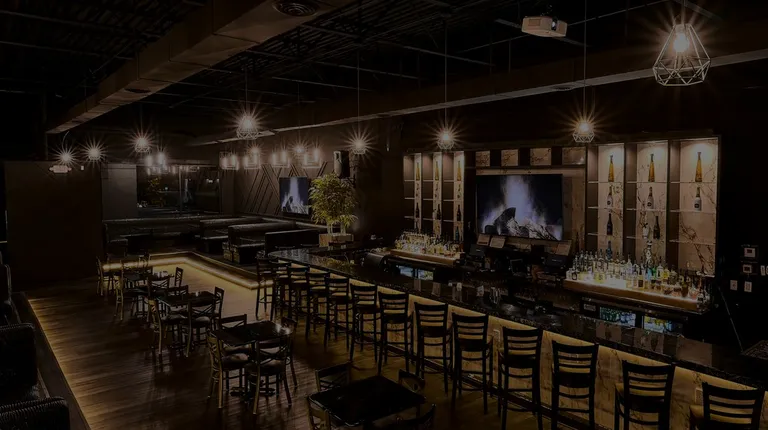 a bar with black leather furniture