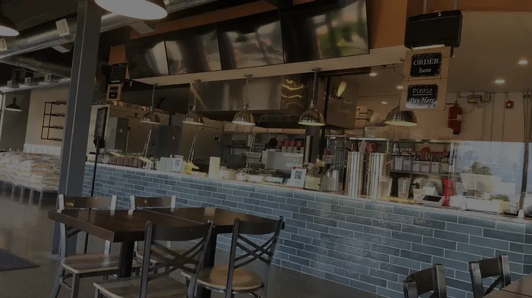 a restaurant counter with a television above it