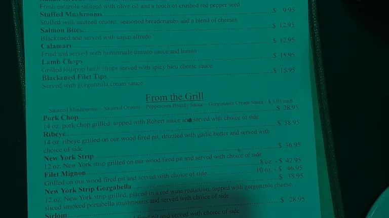 My first visit here and I have to tell ya, it won't be my last. We joined several friends for a birthday dinner. The place is pretty nice inside and kind of dimly lit with green colored bulbs (see pics) assumingly for the upcoming St. Patty's Day holiday. We were seated immediately and well taken care of by our waitress Kelly (who we just so happened to be friends with). We started off with several appetizers between several of us and we shared amongst everyone in our party. We had stuffed mushrooms, calamari, roasted garlic, hot peppers in oil, Italian greens and bruschetta. All were delicious in their own way. The bruschetta was topped with garlic butter, fresh tomatoes, bleu cheese and sundried tomatoes, toasted and drizzled with a balsamic reduction and the stuffed mushrooms comprised of sautéed onions, seasoned breadcrumbs and a blend of cheeses. All was damn tasty as we sampled from each plate. For my entrée I chose the Veal Parmesan. I only order this if the veal is an actual veal cutlet and not a processed patty so luckily it was a cutlet. It was a large tender breaded cutlet, pounded thin, and fried just right. It was accompanied by a nice portion of penne with red sauce of which was delicious. I'm kind of picky about red sauce and this hit the mark. My wife enjoyed the Blackened Filet Tips in a Gorgonzola cream sauce alongside a loaded, twice baked potato. The filet was cooked perfectly to her preference of medium and were deliciously tender. Add the Gorgonzola sauce and this made for a perfect meal. This was a great evening out with friends while enjoying excellent food and a full bar for whatever your drink choice may be. We will be back.